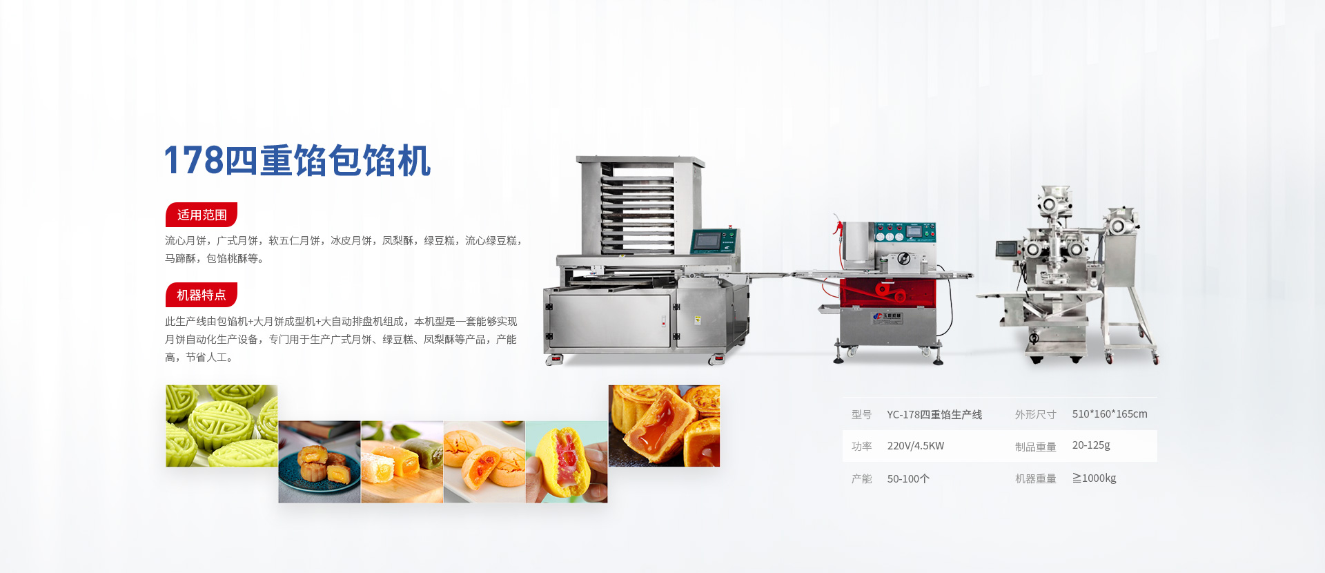 適用范圍:可適用于:烘焙類產品、魚漿類產品、早餐類產品、蒸煮類產品d等,另可生產四重包餡產品如:四重流心月餅、漸變色流心月餅、雙色和果子、金鑲玉月餅。